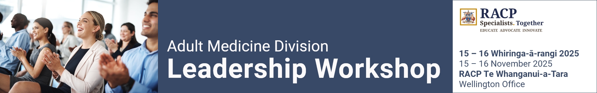 On behalf of the Adult Medicine Division (AMD), we invite early to mid-career AMD Fellows to join us on the weekend of 15 to 16 Whiringa-ā-rangi 2025 | 15 to 16 November 2025 for our third annual AMD Leadership and Management Workshop. This Workshop will be held in person at the RACP Te Whanganui-a-Tara | Wellington Office JacksonStone Building Level 10 / 3 Hunter Street Wellington Central | Te Whanganui-a-Tara Wellington 6011 Aotearoa New Zealand.