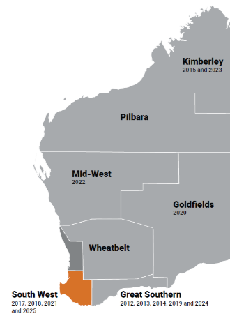 This map represents the locations and years the Organising Committee has delivered the WA Rural Physicians Workshop. This year our Organising Committee is from Bunbury, South West.